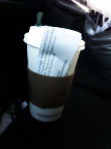 – For my random act I did a variation on paying for the person in line behind you. A week or so ago I wrote out my note and picked up a $10 Starbucks gift card for the lucky recipient. I’ve been keeping the note and gift card in my car, patiently waiting for me to visit a drive through Starbucks. I wanted to pass along my “gift” at a drive through location to make it more surprising and exciting for the recipient. This morning I finally had my chance. After paying for my coffee I handed the envelope to the barista at the window and asked her to pass it along to the next person in line. For some reason doing this made me kinda awkward and nervous – I’m a goof. But it made me happy to know that I brightened a stranger’s day. Heck, if I got a surprise $10 gift card to Starbucks it would not only brighten my day, it would make it. Thanks for giving me the push I needed to participate in this project!